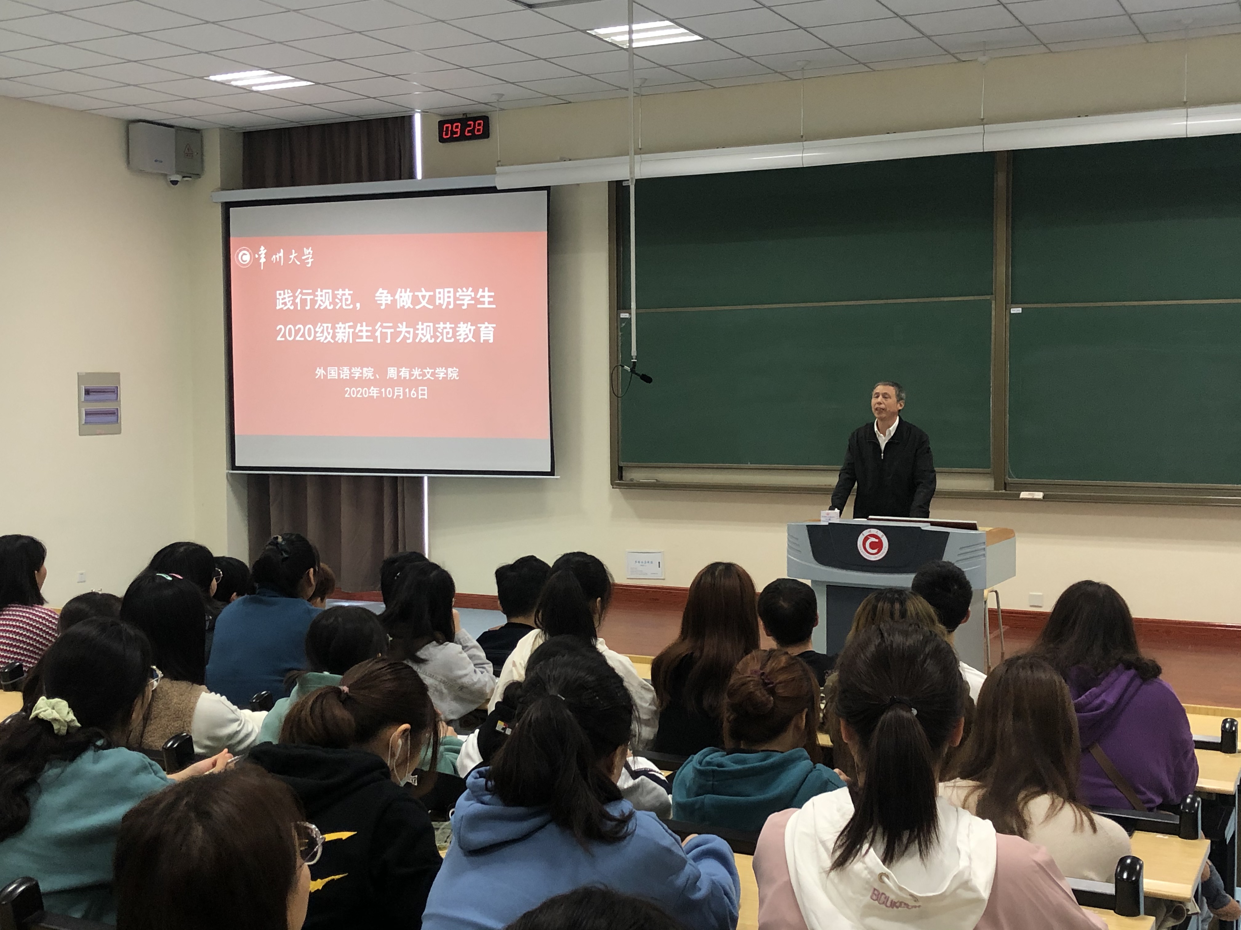 为帮助新生更好地理解学校的规章制度,养成良好的行为习惯,10月16日上午,外国语学院、85po 在教学楼X2阶开展了新生行为规范教育讲座,邀请了关工委赵新华老师、学生处黄龙老师主讲,85po 党委书记焦洁庆主持会议,2020级全体新生参加。
