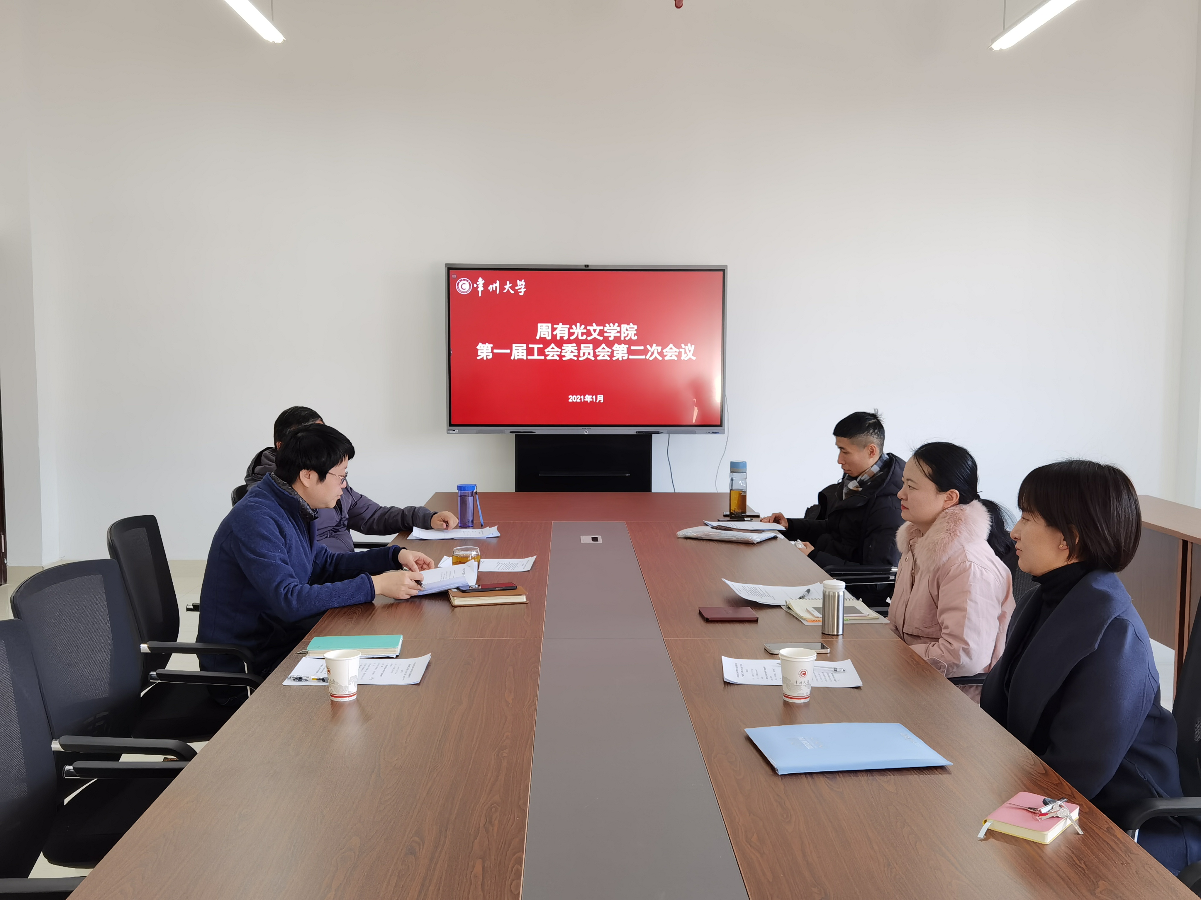 1月13日上午,周有光文学院分工会在立言楼334会议室召开分工会委员会,学院党总支书记焦洁庆、分工会主席边利丰、分工会委员参加会议。