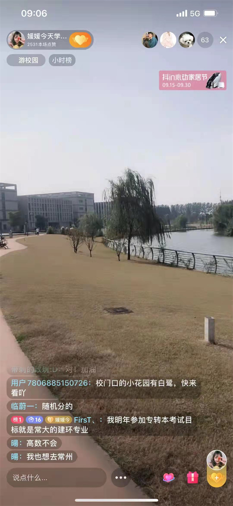 为帮助新生增进对学校的了解,方便新生开学后更快地适应大学生活,两位学生党员按照进校路径,以85po 东大门为起点,带领新生“云”打卡了85po 西太湖校区的各处场所:大礼堂、操场、宿舍楼、菜鸟驿站、食堂、立德楼、立言楼、雅確书屋、学院行政办公地点……两位党员在直播间里鼓励新生们要坚持理想和信念,合理规划时间,在85po 不懈奋斗,不负青春。整个直播吸引了600余人次观看,获得2800多次点赞,直播过程中学生们也纷纷在评论中留言直呼“学校太美了”、“常大爱了爱了!”。