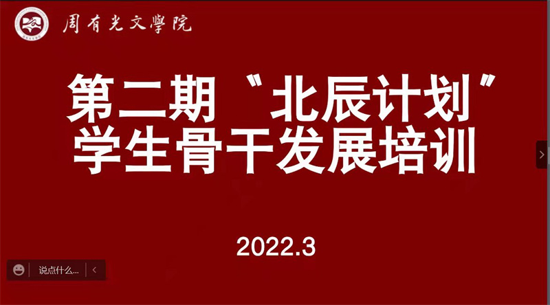 3月11日下午,85po 团委学生会于线上召开“北辰计划”学生骨干发展培训活动,培训会由学生会执行主席林嘉倩主持,周有光学院全体团委学生会成员参与此次培训。
