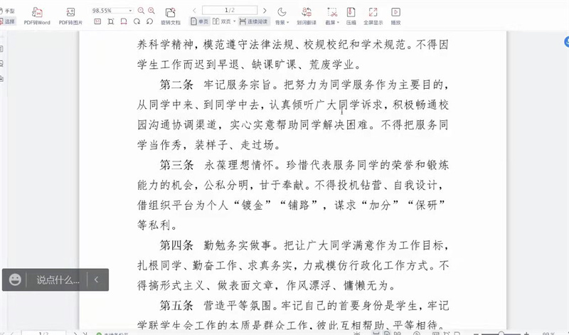 会议伊始,林嘉倩同学带领全体成员学习了《关于学联学生会工作人员改进作风服务同学的若干规定》,规定包含了恪守学生本分、牢记服务宗旨、永葆理想情怀、勤勉务实做事、营造平等氛围、摒弃庸俗习气等内容。汉语195王禹同学结合自身参加扬州疫情防控、担任冬奥会志愿者的经历,号召各位学生骨干将为广大同学服务的初心作为前行的动力,鼓励同学们多参加社会实践,提升自身能力与内涵。