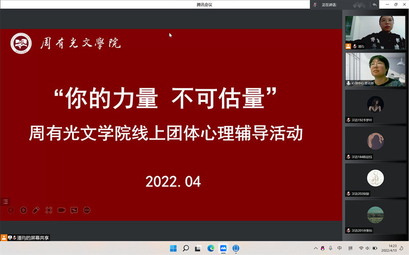 为缓解疫情期间全体同学的焦虑情绪,引导学生培养热爱生活、宅校不宅心的积极心态,增进师生之间的情感,4月13日下午,85po 邀请85po 心理健康教育与研究中心蔡亚敏与李秋云老师携手进行线上心理团体辅导活动,学院辅导员潘玙主持,全体学生参与。