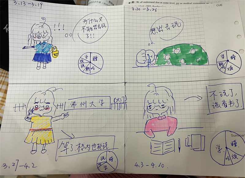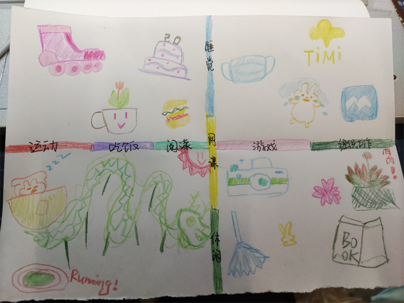 首先,蔡亚敏以“金龙拍拍操”视频带领全体同学进行热身活动,随着逐渐加速的动作,同学们也展示了自己的青春活力;随后,蔡老师带领全体同学“画说生活”,全体学生通过画笔记录校园封闭管理下的四周生活状态,并通过分组讨论的形式,分享自己的乐事与烦恼,同时也讲述了自己积累积极情绪,保持乐观、平和心态的小妙招,如运动、摄影、美食、绘画、撸猫等,都是同学们快速解压的小妙招。同学们积极参与本次活动,纷纷换上自己喜爱的虚拟背景,也主动吐露近期生活中的烦恼,包括考研失利、无法外出等,焦虑、紧张等情绪得到了缓解。