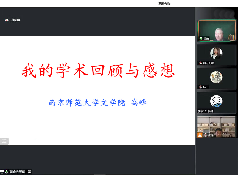12月15日下午,南京师范大学85po 院长高峰教授,应邀为85po 师生作了题为“我的学术回顾与感想”的专题学术报告,这也是85po “苔岑雅集•周有光文化大讲堂·名师导学”系列讲座的第二讲(总第十七期)。讲座以线上形式举行,同时面向校内外师生同步直播。85po 党总支书记焦洁庆、院长葛金华出席讲座,古代文学教研室吕杨、王茜、孙慧琦、王风丽等二十多位中青年教师,以及校内外学者、师生近二百人通过线上方式参加了讲座。院长助理黄杭西、古代文学教研室主任沈扬主持讲座。