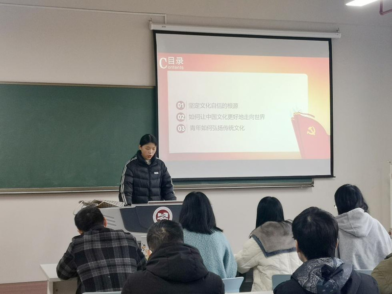 本次活动由学生党员春雪围绕“坚定文化自信,强化中华文化生命力”进行学习宣讲,从“坚定-愿景-传播”三个维度讲述有思想、有深度的中华文化影响力。围绕党的二十大报告中文化自信这一部分,春雪同志指出,传播力决定影响力,必须从国际传播力和中华文明传播力这两方面展开,通过运用全媒体手段、强化技术赋能和发挥青少年作用这三个手段,着力提高中华文化的感召力、中国形象亲和力、中国话语说服力。学生党员肩负传统文化传播重任,应加深具体文化学习深度、鉴学主流媒体宣传广度,采用“汲取和借鉴家风家训”“汲取和借鉴务实担当精神”“汲取和借鉴正确人生观价值观”这三个递进的层次发挥出新时代青年党员的时代担当和青春责任。