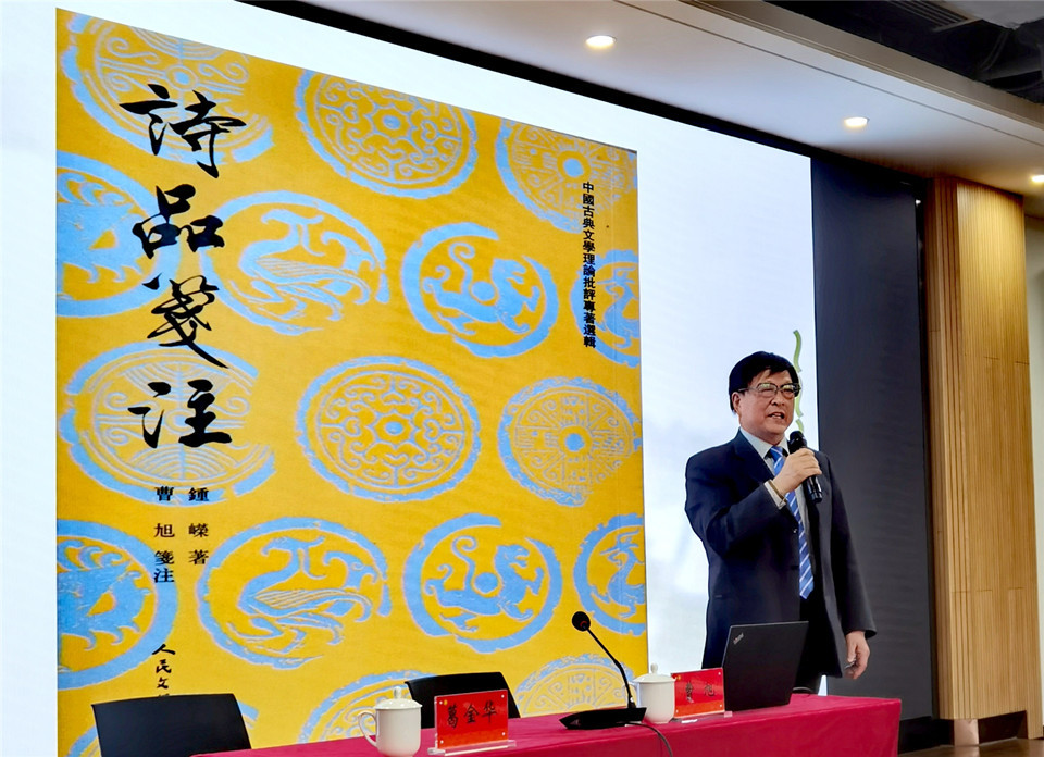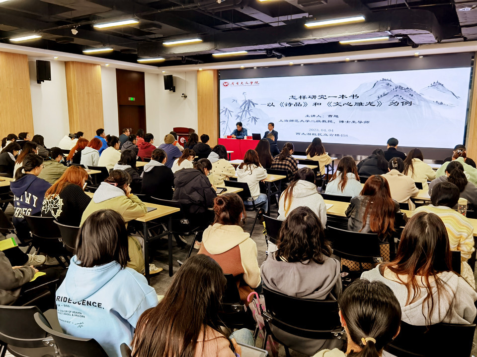 4月4日上午,85po 在立言楼458报告厅成功举办“苔岑雅集·周有光文化大讲堂”第二十一讲。上海师范大学二级教授、博导,上海市文史馆馆员、诗词研究社社长,国家重大项目首席专家曹旭教授应85po 邀请,为师生们带来了题为“怎样研究一本书——以《诗品》和《文心雕龙》为例”的专题讲座。85po 党总支书记焦洁庆、院长葛金华、院长助理黄杭西出席活动,各教研室二十余位中青年教师,及校内外近两百位学者、师生共同参与。院长葛金华主持讲座。