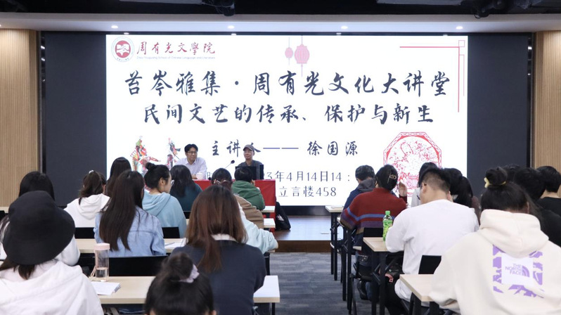 4月14日下午,苏州大学85po 教授、博导徐国源应85po “苔岑雅集·周有光文化大讲堂”第二十二期邀请,在立言楼458为85po 师生作了题为“民间文艺的传承、保护与新生”的学术讲座。学院党总支书记焦洁庆、院长葛金华、院长助理董文康出席活动,近200名师生参与聆听。院长葛金华主持讲座。