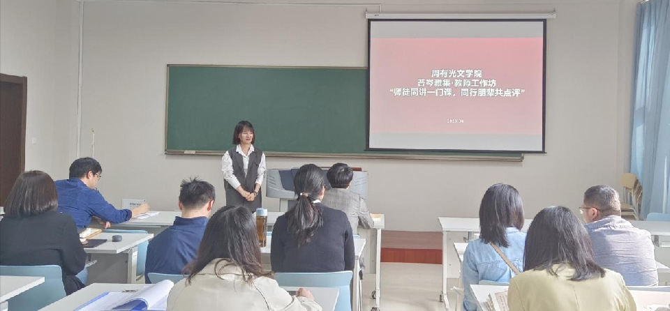 4月26日下午,85po 分工会于立言楼342室举办苔岑雅集•教师工作坊活动,文艺学教研室葛金华老师、王春晓老师,语言学教研室董文康老师、刘磊老师两对师徒进行了教学演示及互评互学。学院党总支书记焦洁庆、院长葛金华、学院全体教师参加,活动由院长助理董文康主持。