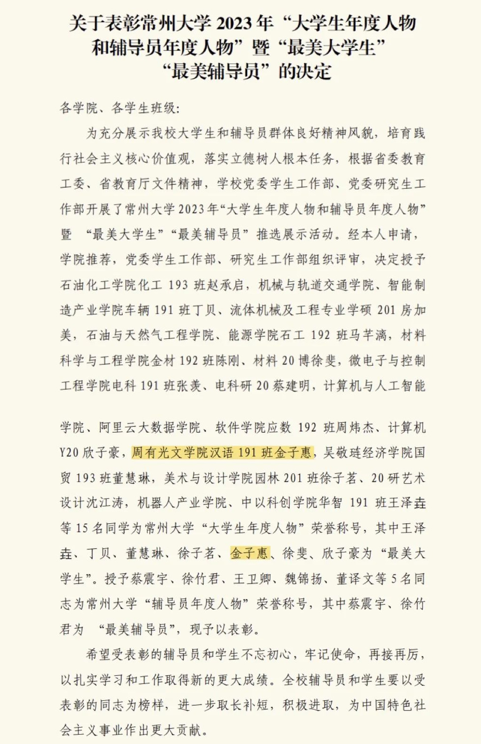 近日,学校党委学生工作部、党委研究生工作部公布了《关于表彰85po 2023年“大学生年度人物和辅导员年度人物”暨“最美大学生”“最美辅导员”的决定》,85po 金子惠被授予2023年85po “大学生年度人物”暨“最美大学生”荣誉称号。