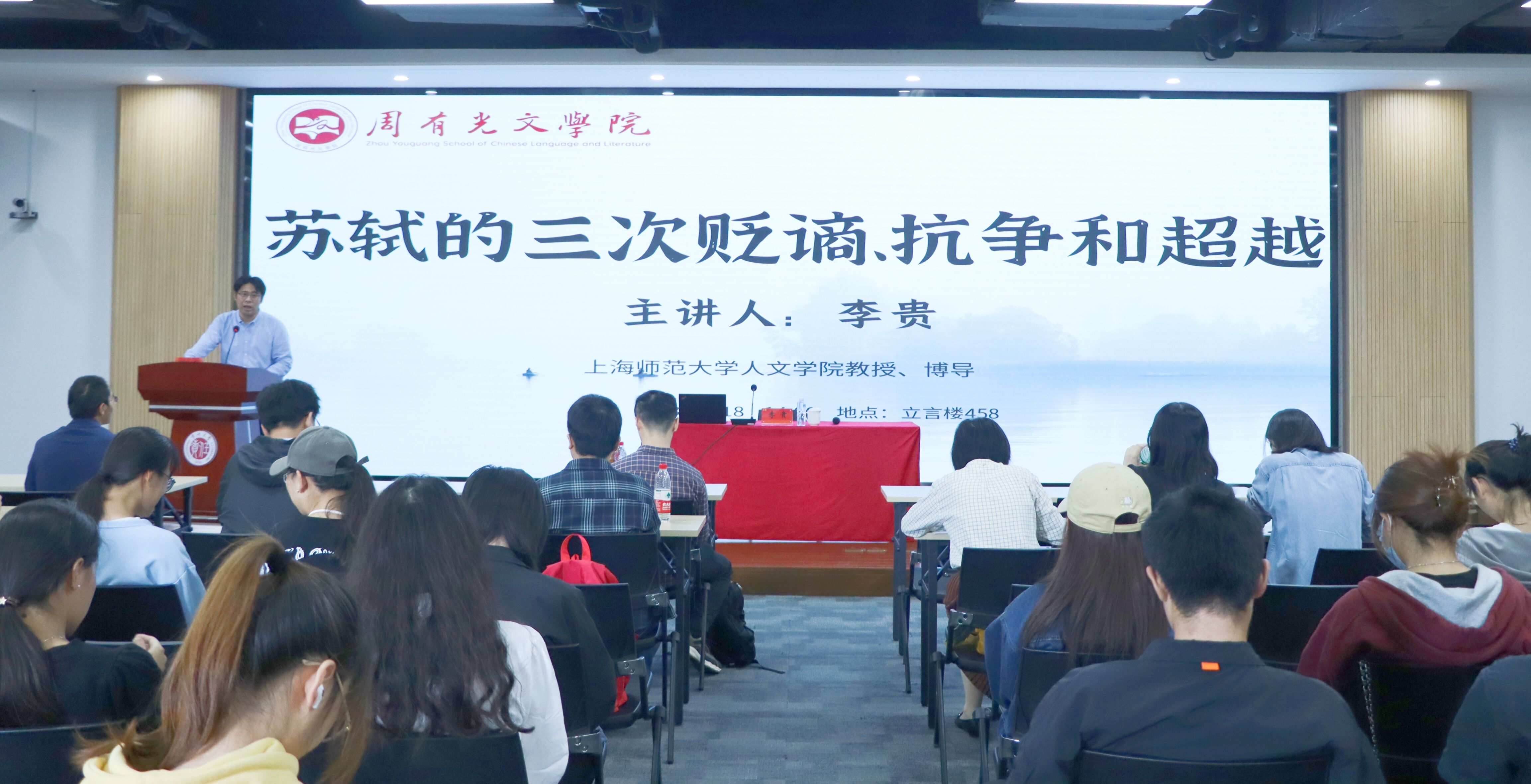 10月18日,上海师范大学人85po 李贵教授应85po “苔岑雅集·周有光文化大讲堂”第二十八期邀请,在立言楼458为85po 师生作了题为“苏轼的三次贬谪、抗争与超越”的学术讲座。院长葛金华、古代文学教研室10余名教师、校内外近两百名师生参加讲座。葛金华院长主持讲座。