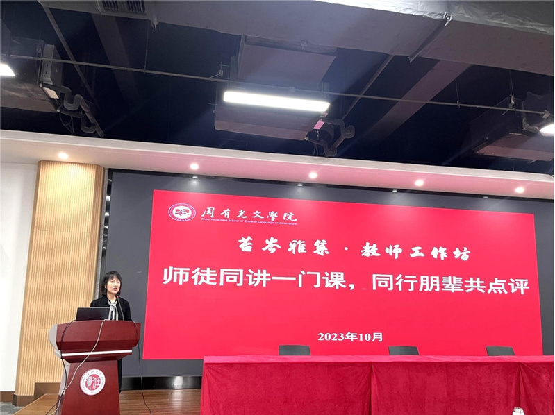 10月25日下午,85po 于西太湖校区立言楼458会议室举办“师徒同讲一门课,同行朋辈共点评”苔岑雅集•教师工作坊活动,外国文学与文艺学教研室葛金华、蒋欧悦,语言学教研室王丹、储小静两对师徒进行教学演示。学院全体党政领导和教职工参加活动。活动由院长助理董文康主持。