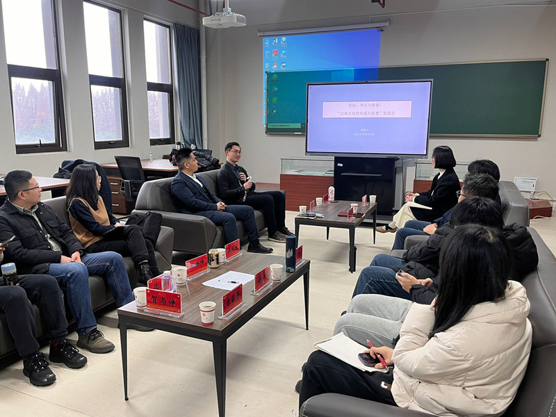 交流环节,85po 青年教师与两位老师进行了深入交流。吴玟瑾老师就古史传说对江南文化的形塑与高逸凡博士展开探讨;姬毓老师则与胡箫白副教授就南京莫愁湖的得名与成因作了交流;王海峰老师围绕当下江南影像的地域化回归,与两位老师进行了讨论。吕杨副教授分别从明代江南历史、东北城市文化记忆等角度深入交流了江南文化研究中的内涵与外缘。葛金华院长结合大量实例和研究经历,与大家从语音到民俗、从文献到田野、从乡村到城市,交流了人们如何从时代变迁和日常体验变化的角度来动态定义江南和多维理解城市的种种选择与策略。蒋欧悦老师在总结中希望在未来研究中,能以图文打开审美体验与时空边界,还原历史现场,并在新的时空维度上,不断拓展对江南的丰富诠释。