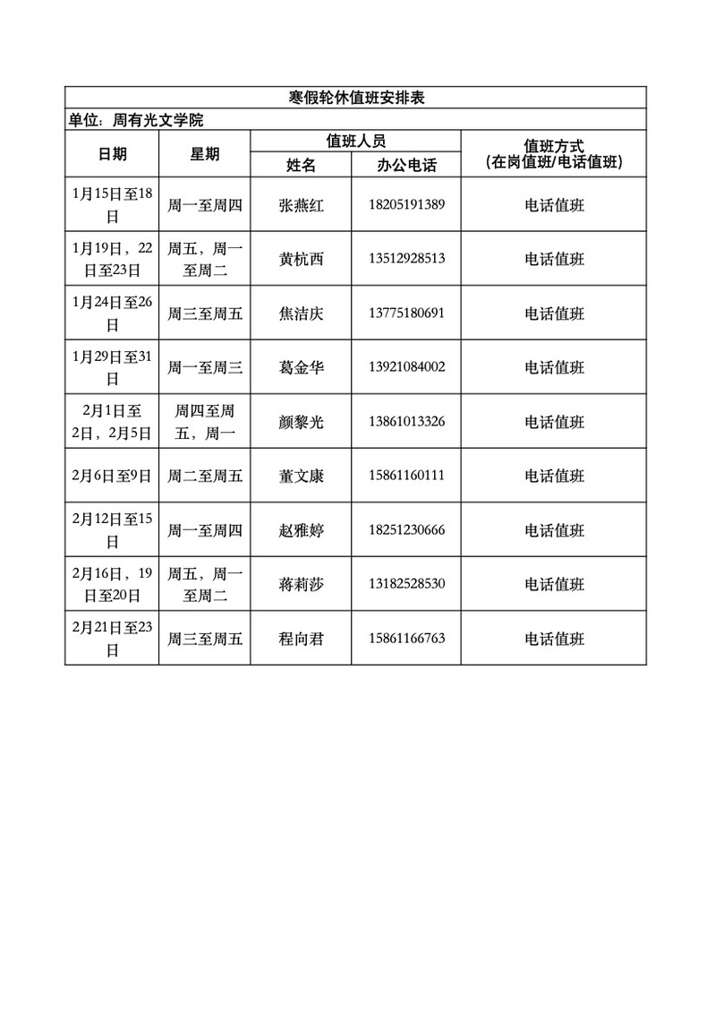 85po 2024年寒假值班安排表