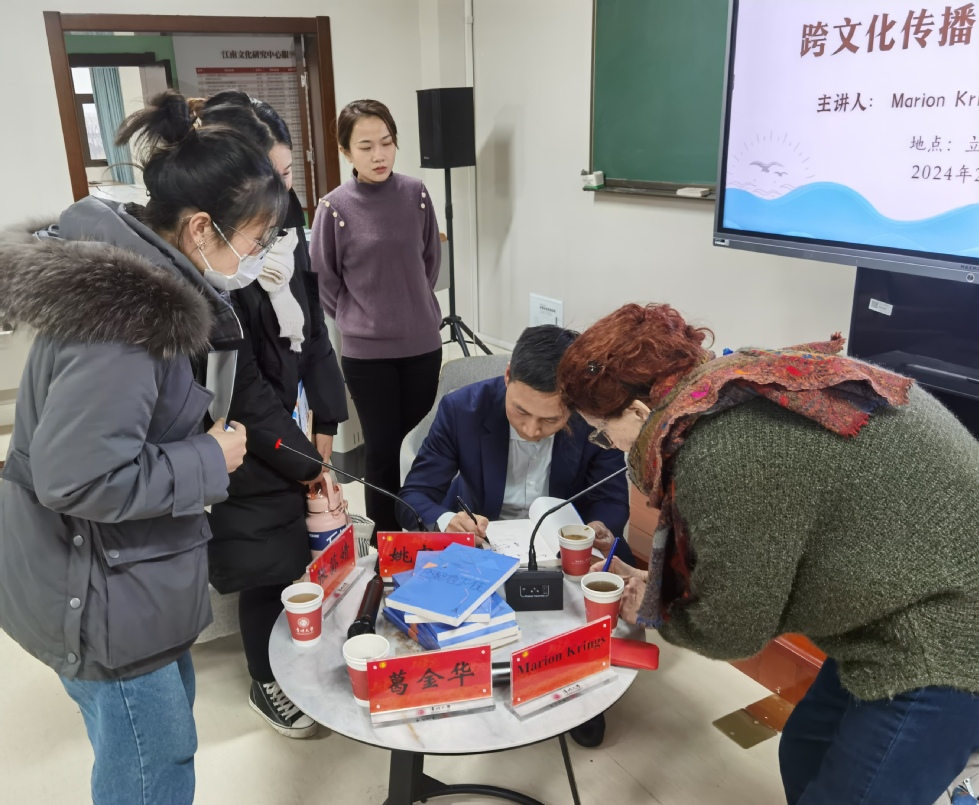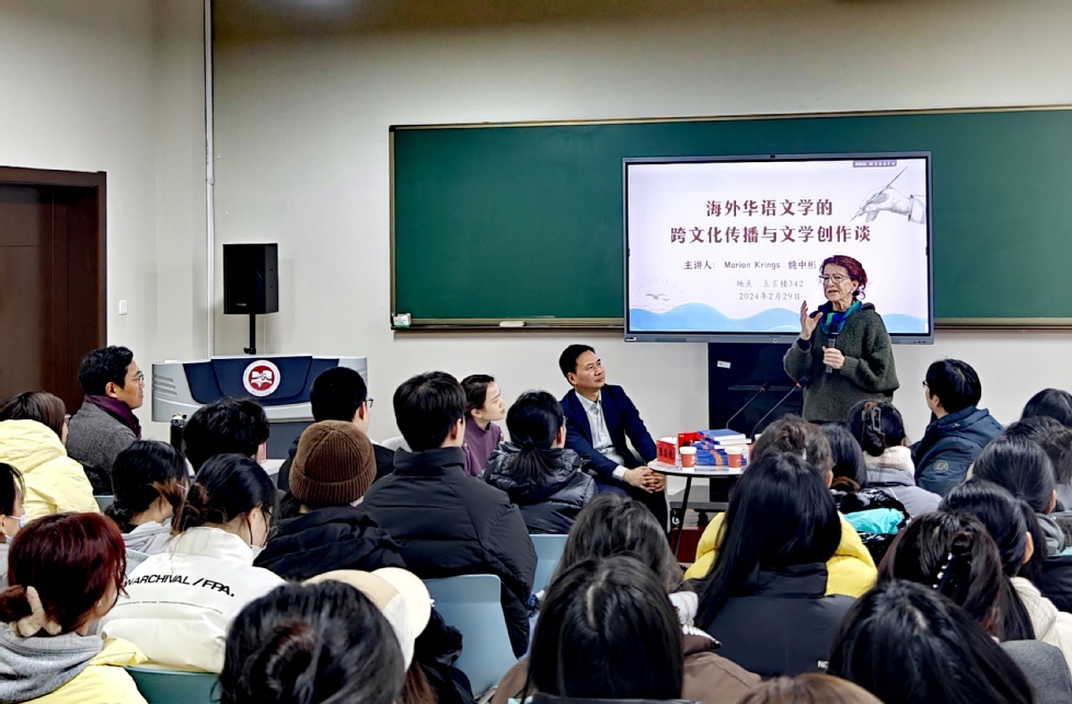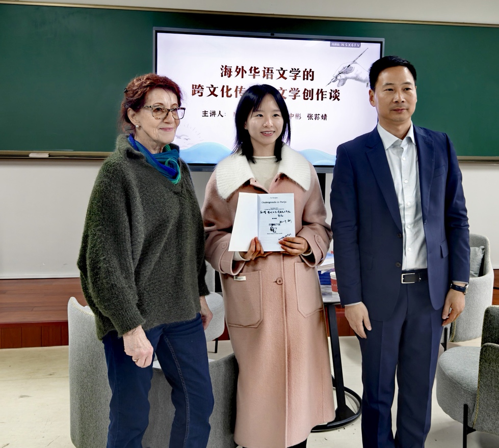 2月29日,我校85po 、跨文化研究院在西太湖校区立言楼342文化教室联合举办“海外华语文学的跨文化传播与文学研讨会”。法国著名翻译家、作家、荷兰鹿特丹大学博士玛瑞安(Marion Krings),《巴黎地下铁》等小说作者、常州籍作家姚中彬,以及南京籍翻译家、作家张荪婧应邀与我校师生分享了文学创作、翻译和传播的故事与经验。我校跨文化研究院院长杜志峰参会,85po 院长葛金华主持研讨会。