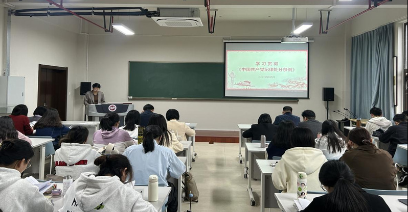 课上,焦洁庆从《条例》内容及修订历史、近三次修订重点和2023新增修改重点条文三个方面进行详细介绍,并强调了与高校师生密切相关的“在授予学术称号中弄虚作假、违规谋利”“违背公序良俗、在网络空间有不当言行”等有关条款。她强调,全体党员应当认真学习《条例》,把遵规守纪刻印在心,内化为言行准则,树牢纪律观念、强化纪律敬畏、严格纪律约束,坚决不碰党纪国法的“高压线”,始终做到忠诚干净担当。(通讯员/朱潇 审核/焦洁庆)