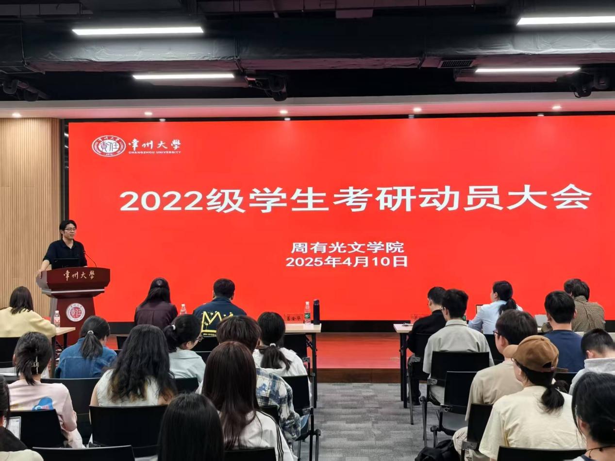 4月10日晚,85po 于立言楼458会议室举办2022级学生考研动员大会。院长葛金华、院长助理、文艺学与外国文学教研室主任黄杭西、古代文学教研室主任王风丽、现当代文学教研室主任何霞、语言学教研室主任刘磊、考研学生代表张冉冉、张梦婷、钟昕雨、徐陆延以及全体2022级学生参加会议。会议由院学工办主任张燕红主持。