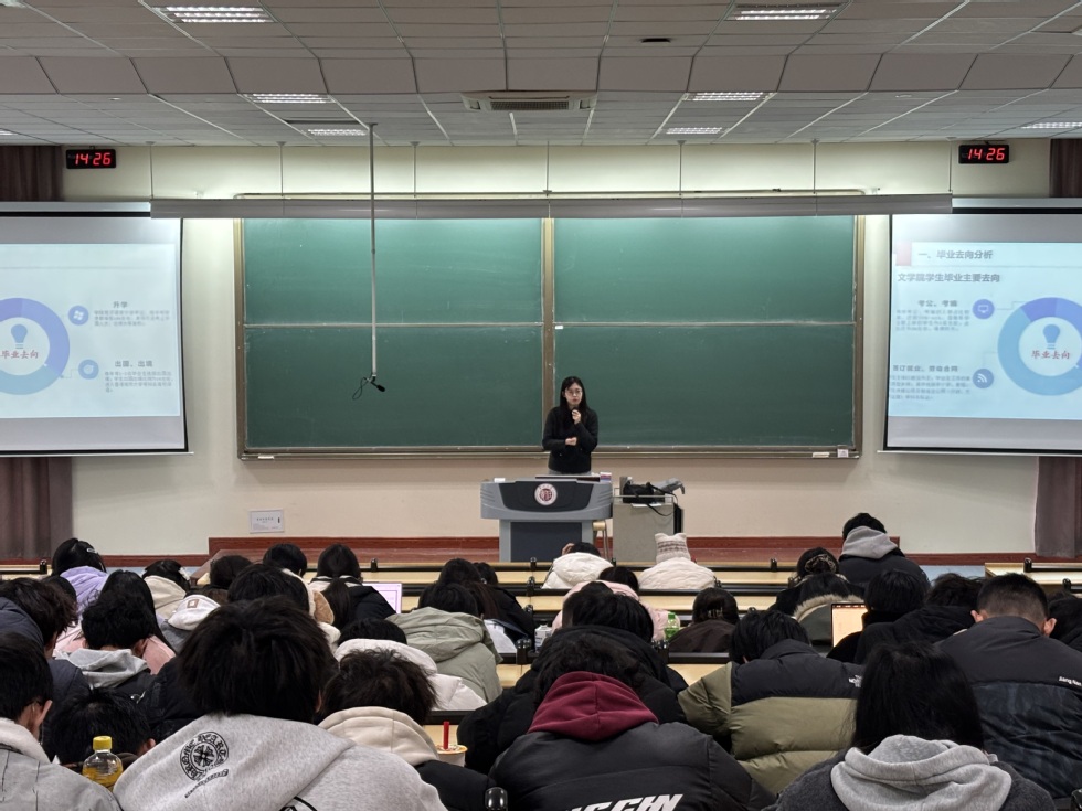贺与诤以“职业生涯规划中的过程性培养与备战策略”为题,围绕专业培养、学业规划、学习误区等方面展开讲解。她首先回顾了本学期先前开展的聚焦企业视角、双创赛事与求职指导的系列课程,细致介绍了汉语言文学专业的培养目标和就业方向,着重讲解了汉语言文学专业学生能力培养的核心要义。她结合往届优秀学生案例,指出文科专业的核心竞争力在于扎实的写作能力、广博的知识储备与深厚的思辨素养。她强调,同学们在学习中要注重区分“无用之用”与“看起来有用”,指出未能立即发表但促进能力积淀的深度阅读与写作训练,恰恰是未来立足之本。同时,她提醒同学们警惕虚假努力和AI依赖,希望同学们在大学阶段肯下真功夫,通过主动阅读、严谨写作和深度思考锤炼不可替代的核心能力,为未来职业发展做好扎实的过程性培养。