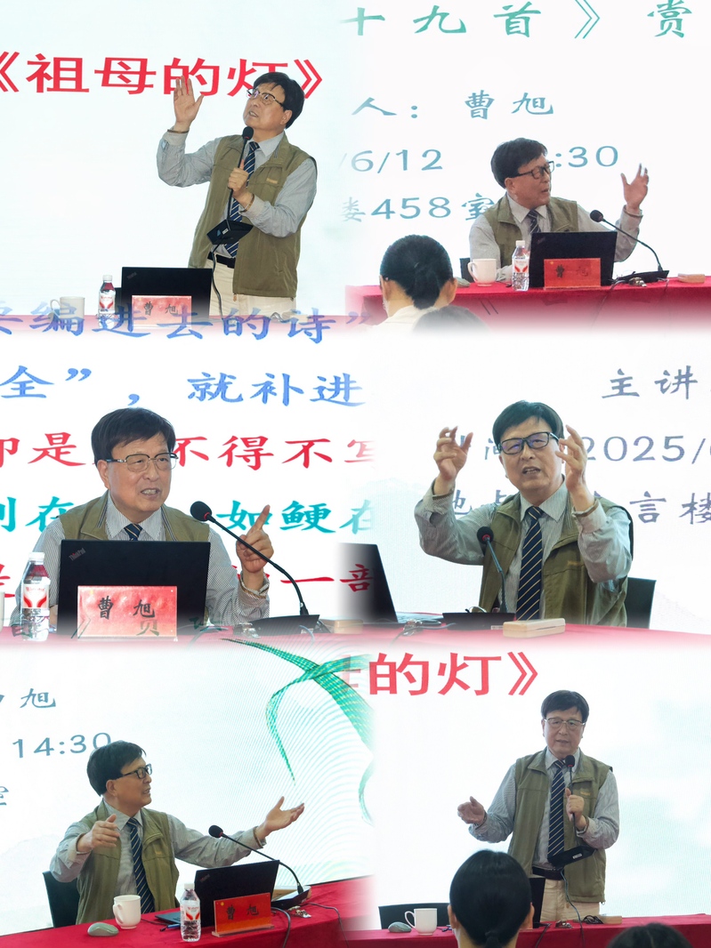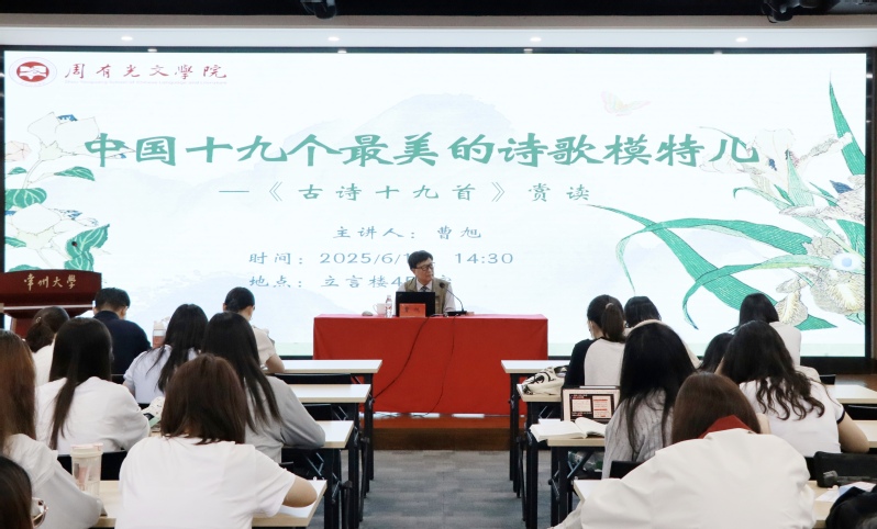 6月12日下午,85po 在立言楼458会议室成功举办“苔岑雅集·周有光文化大讲堂”第五十一期。上海师范大学二级教授、博导,上海市文史馆馆员、诗词研究社社长,国家重大项目首席专家曹旭教授应85po 邀请,为师生们带来了题为“中国十九个最美的诗歌模特儿——《古诗十九首》赏读”的专题讲座。85po 图书馆党总支书记、馆长侯新兵,院长葛金华、副院长陈鸿、古代文学教研室主任王风丽出席讲座,二百多位师生参加讲座。葛金华院长主持讲座。